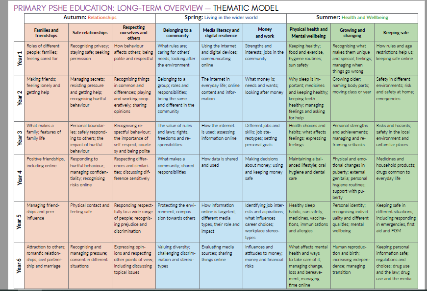 PSHE is taught as a timetabled lesson each week. We use the PSHE Association Thematic Approach to ensure all year groups have a focus as part of a whole school scheme.